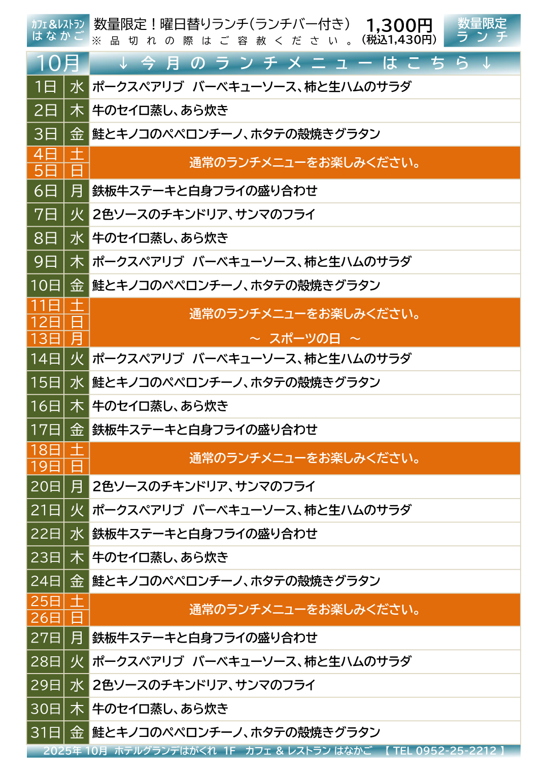 HOME > レストラン > 新着レストランイベント > 【10月】曜日替りランチメニュー