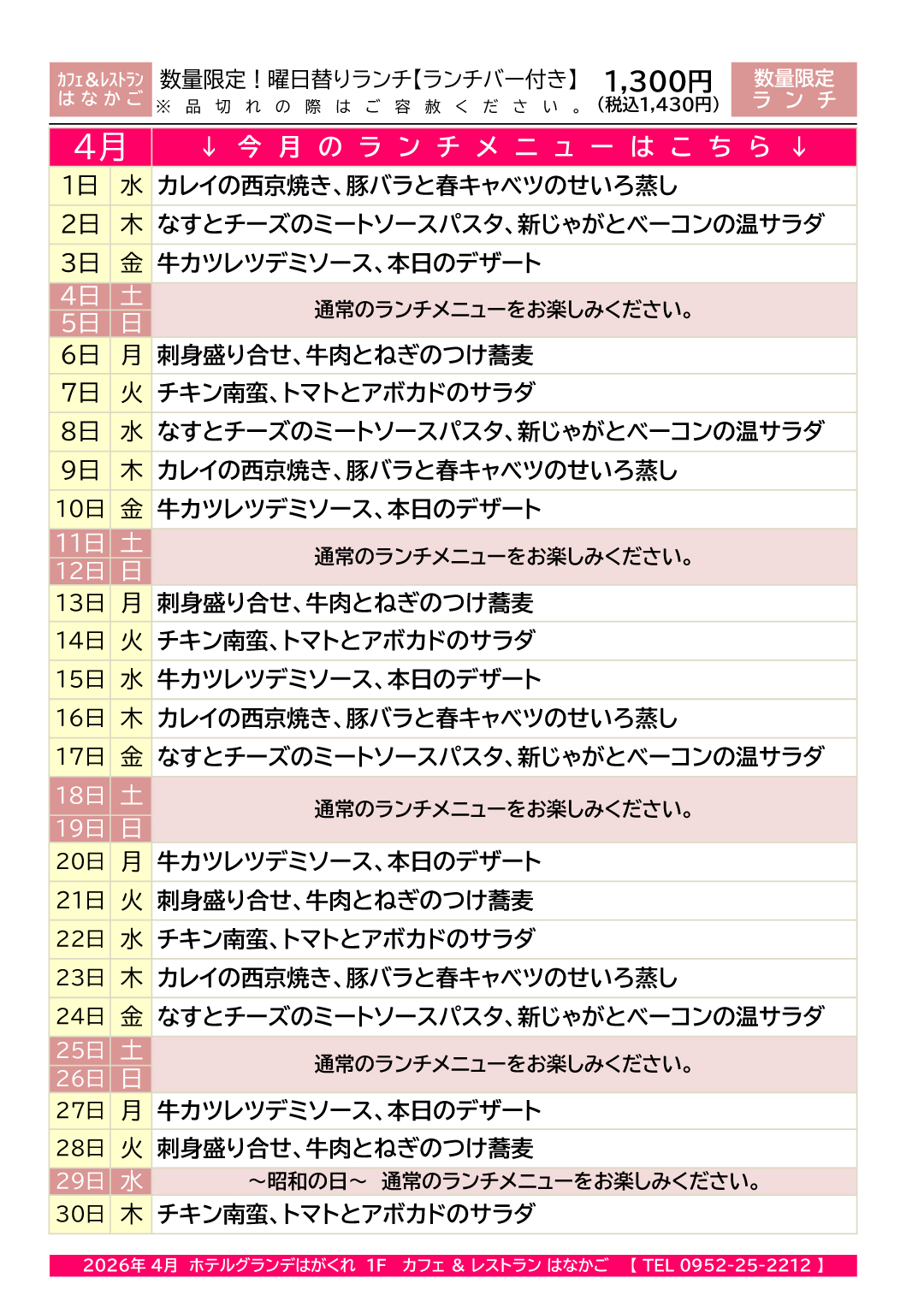 HOME > レストラン > 新着レストランイベント > 【4月】曜日替りランチメニュー